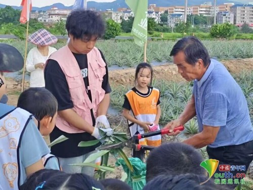 供图图为志愿者正在与孩子们一起玩游戏。林竞男 供图图为志愿者正在帮助农场主王森谅采摘凤梨。林竞男 供图